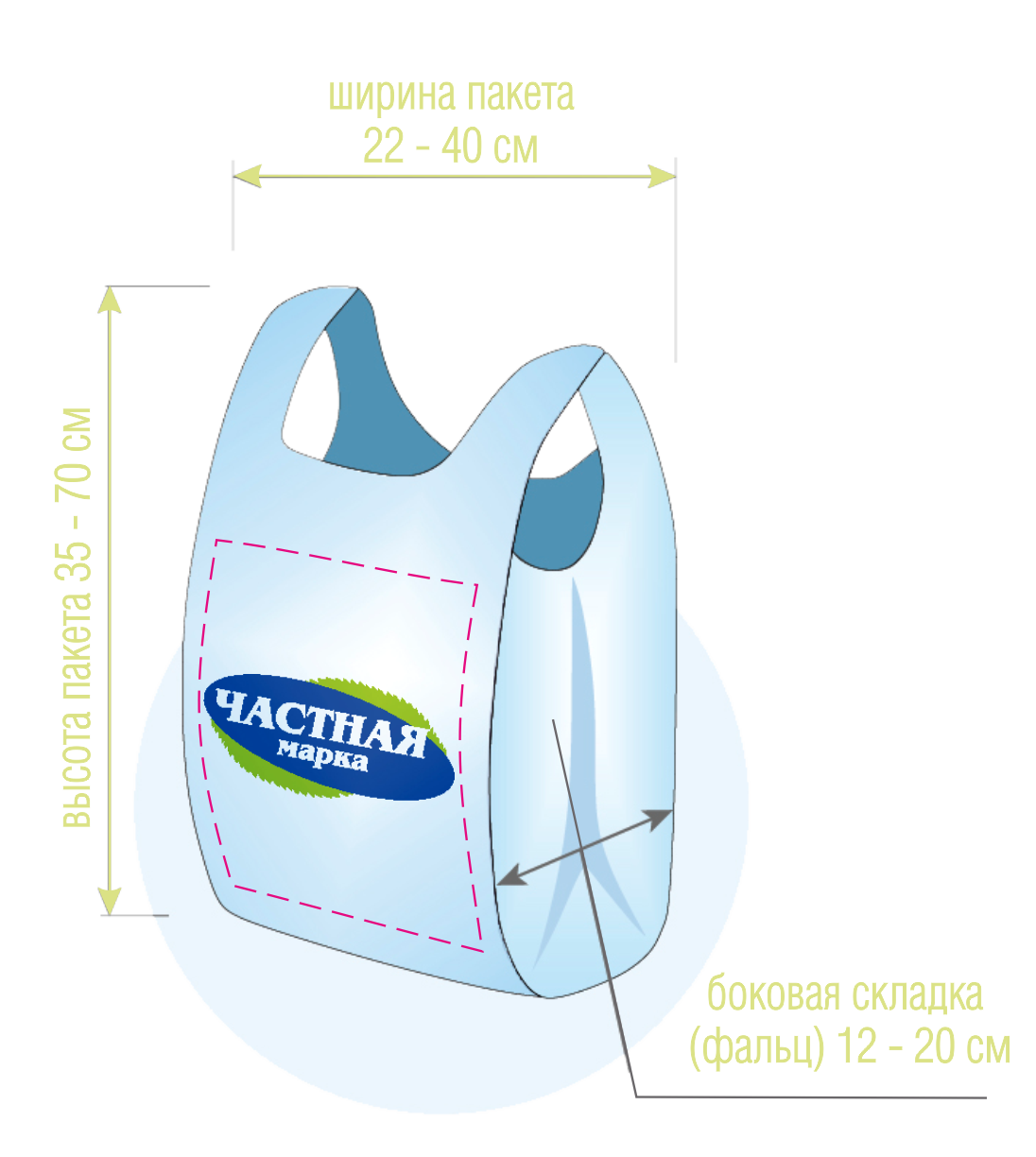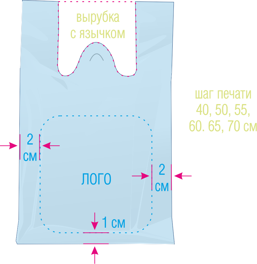Полиэтиленовые пакеты с ручками изготавливаются с фальцами — боковыми складками. Лучше упаковывать объемную и сложную продукцию. Благодаря складкам пакетам-майкам вместимость, высокая грузоподъемность (до больших 25 кг) и удобство. Ширина фальцев — от 12 до 20 см. Сегодня в каждом торговом центре и небольшом магазине используется эта удобная упаковка для промышленных товаров и продуктов питания.